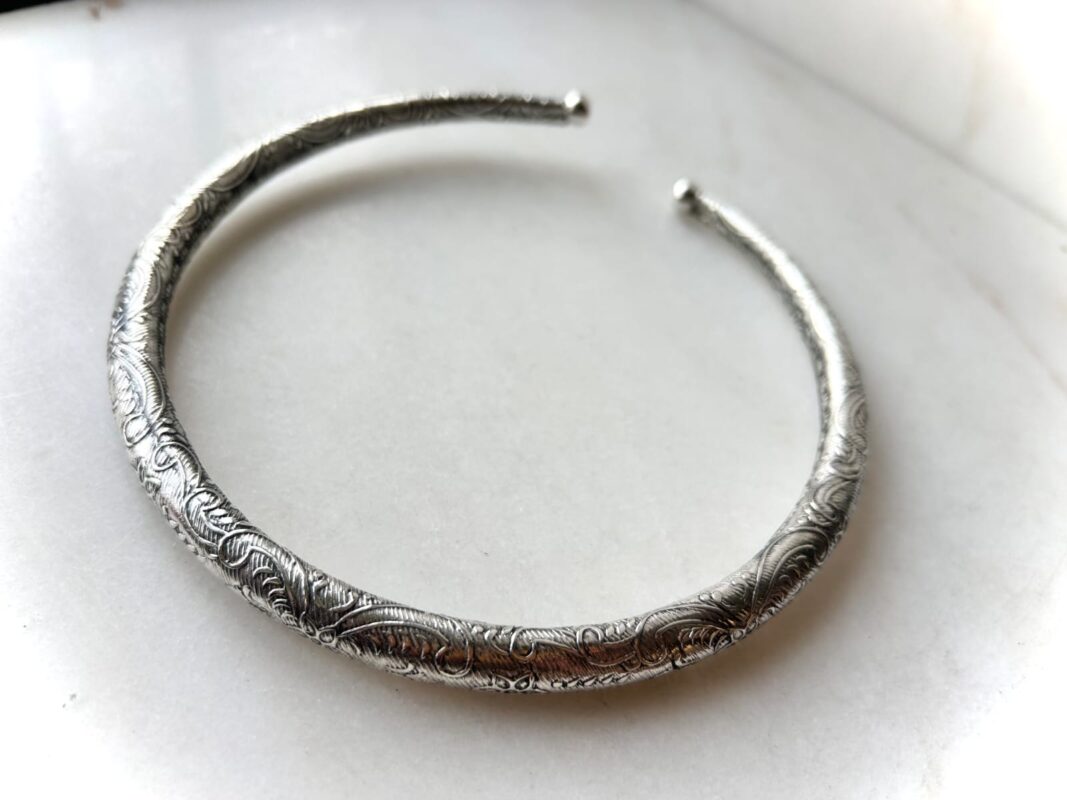 A refined silver tone brass choker featuring an all-over engraved vine and scroll motif. Designed to make a strong statement while remaining comfortable and wearable.