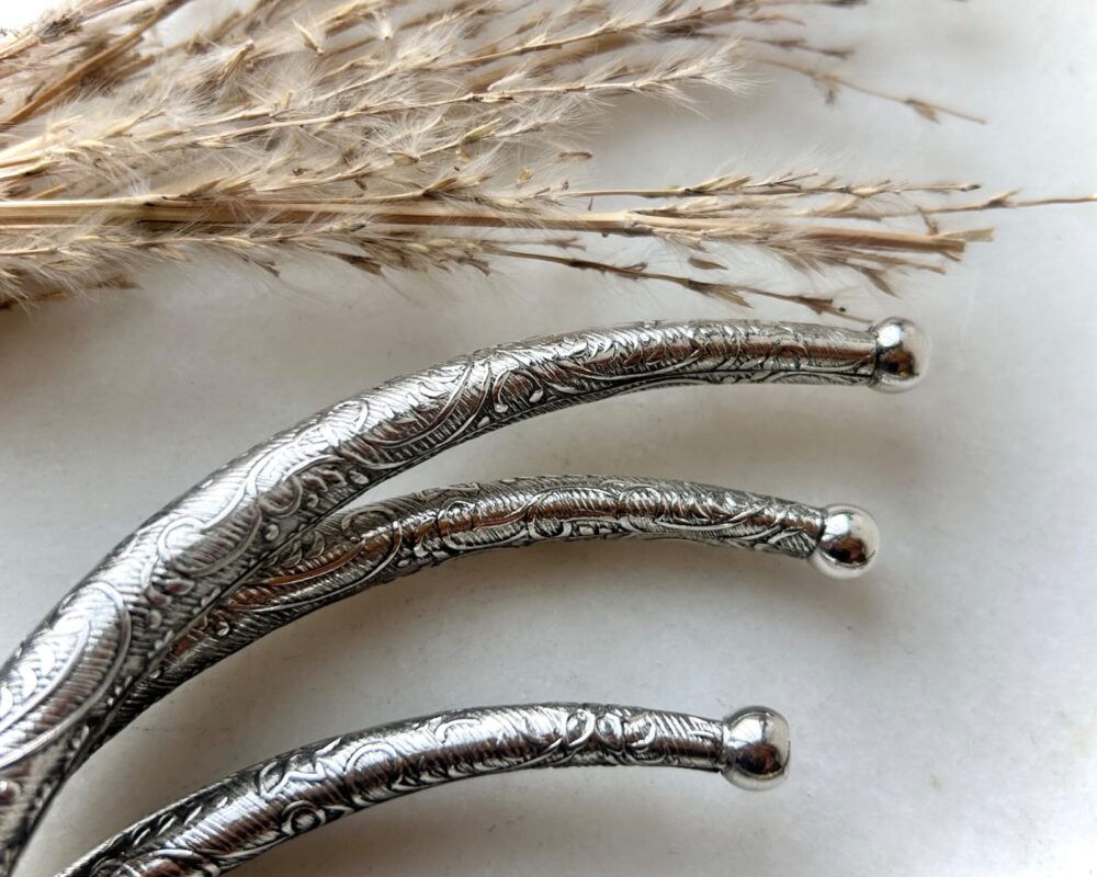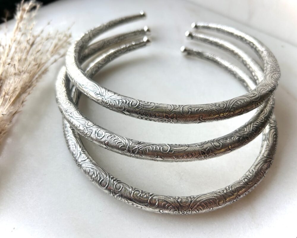 The Whispering Vines Engraved Silver Tone Brass Choker is a delicate balance of strength and softness. Crafted from solid brass and finished in a luminous silver tone, this piece is adorned with an intricate, continuous engraving inspired by flowing vines and organic scrollwork. The rounded profile gives the choker a smooth, comfortable fit around the neck, while the detailed surface catches light beautifully, revealing depth and texture from every angle. Its open design allows for gentle adjustment, making it easy to wear alone as a statement or layered with other necklaces for a more expressive look.